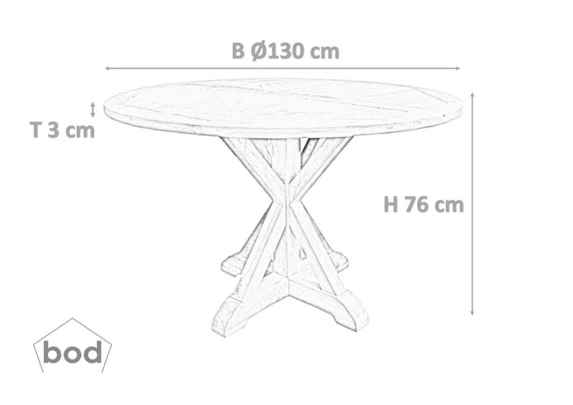 Bordet är 130 cm i diameter, höjden är 76 cm.