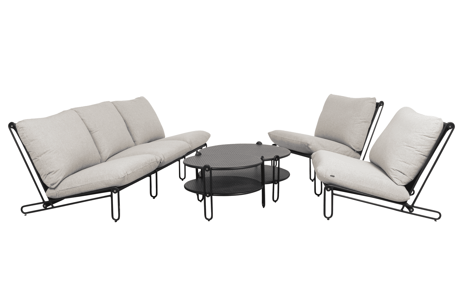 Soffgrupp i svart aluminium med cley beige allvädersdynor. Består av 5 st fåtöljer och 2 st. bord. Blixt kan man bygga ut som man vill, det finns oändliga kombinationer.