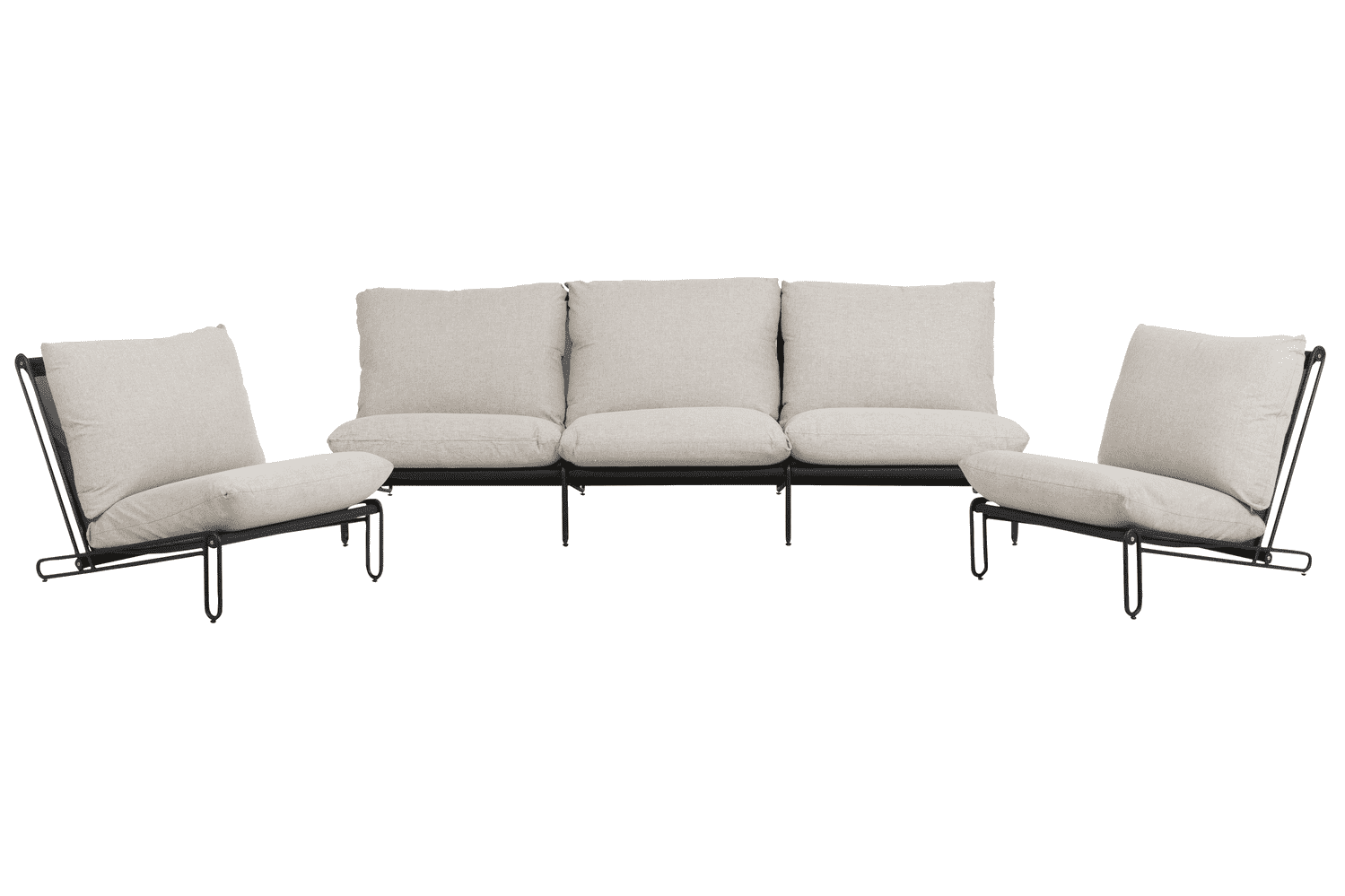 Soffgrupp i svart aluminium med cley beige allvädersdynor. Består av 3-sitssoffa och 2 st fåtöljer. Blixt kan man bygga ut som man vill, det finns oändliga kombinationer.