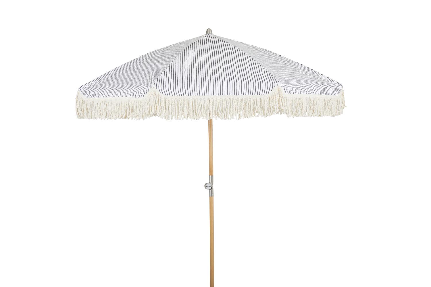 Brafab Gatsby Parasoll gråvit är ett tiltbart och vikbart parasoll med skruv nedtill. Naturfärgad stång och vitt tyg med grå linjer samt fransar längs kanten. Gatsby parasollfot finns att köpa till.