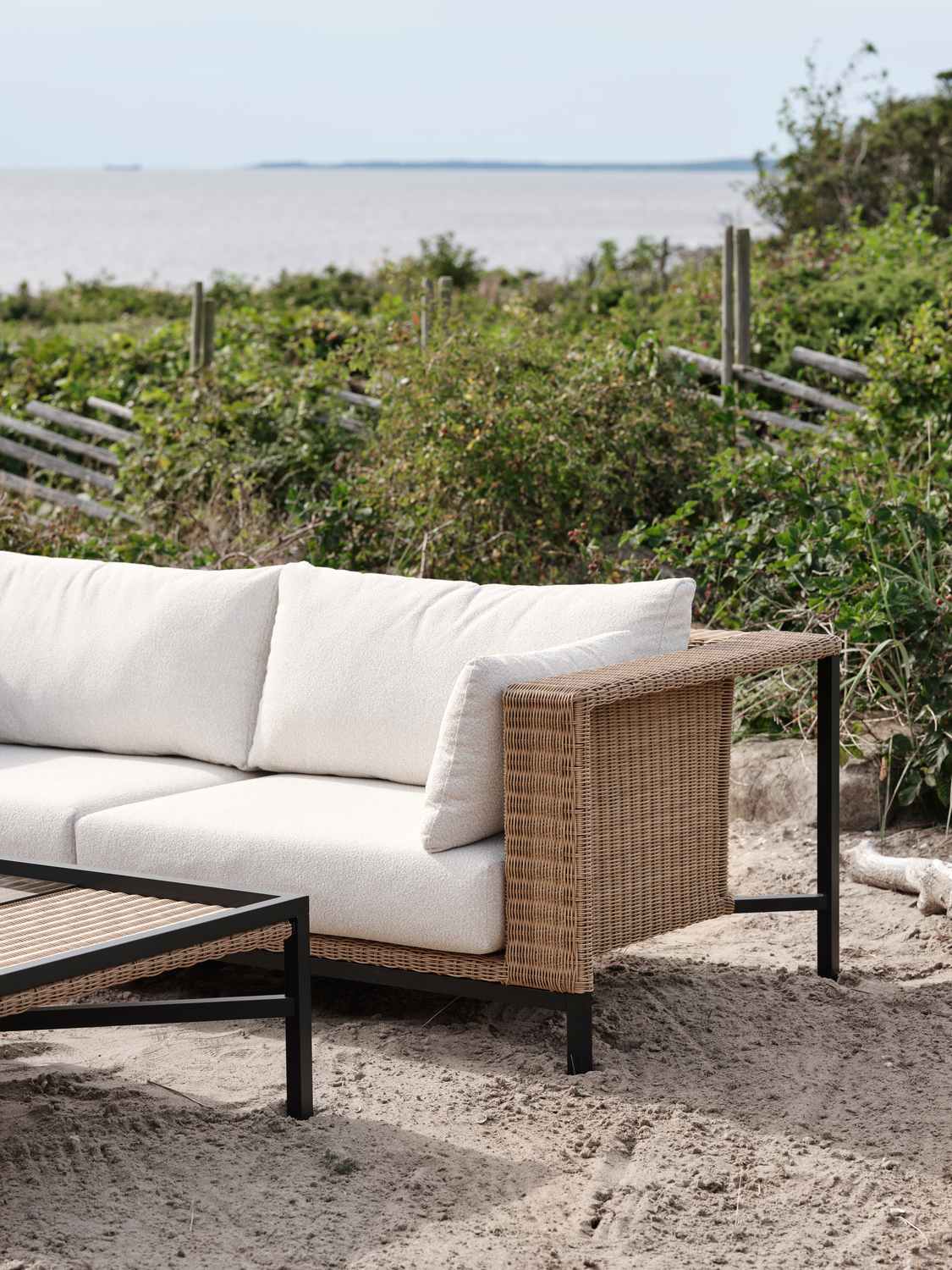 Det som skiljer Shell åt är dess unika blandning av designinfluenser. De rena linjerna och de neutrala färgerna för den lugna enkelheten i skandinavisk design, medan värmen och känslan från konstrotting fångar den avslappnade, soliga känslan från Medelhavet. Denna blandning gör Shell till det perfekta valet för en utomhusoas som är både trendig och tidlös. Den öppna ryggen visar ramen, ytterligare en designdetalj. Ram i svart aluminium och dynor i vitt olefintyg.