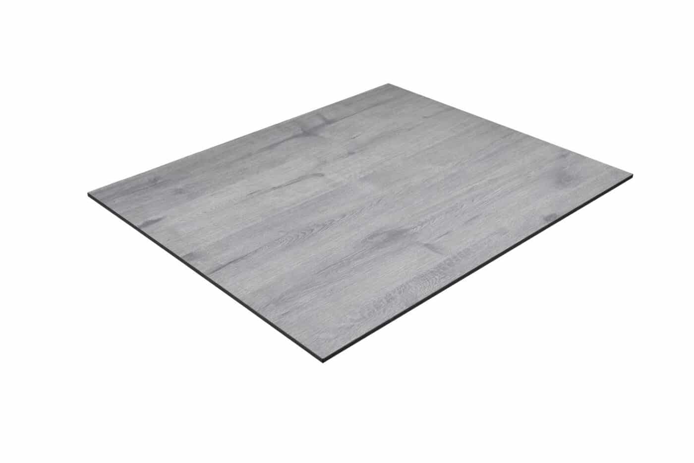 Gråfärgad bordsskiva med naturtrogen trälook i laminat tåligt för väder och vind.