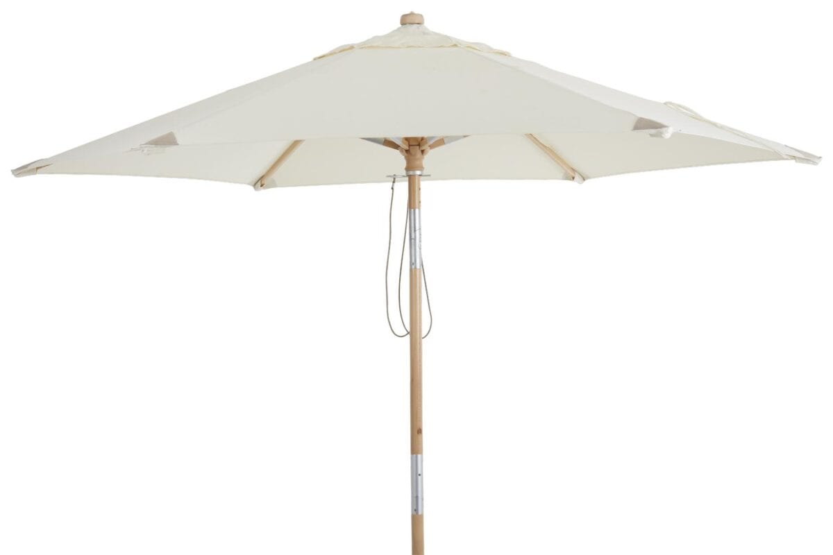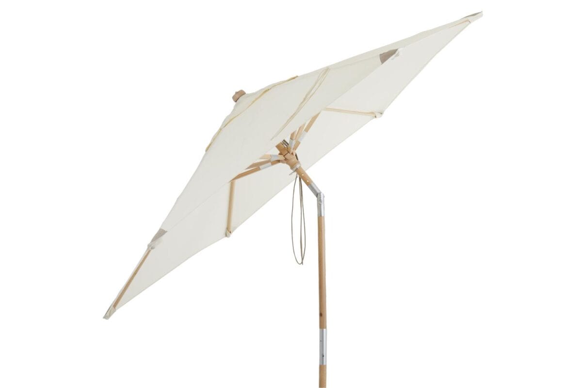 2,5 m parasoll av trä (bok) med mattlackerad yta. 2-delad stång med push-tilt. Vackra läderskoningar och väv av 250 g polyester.