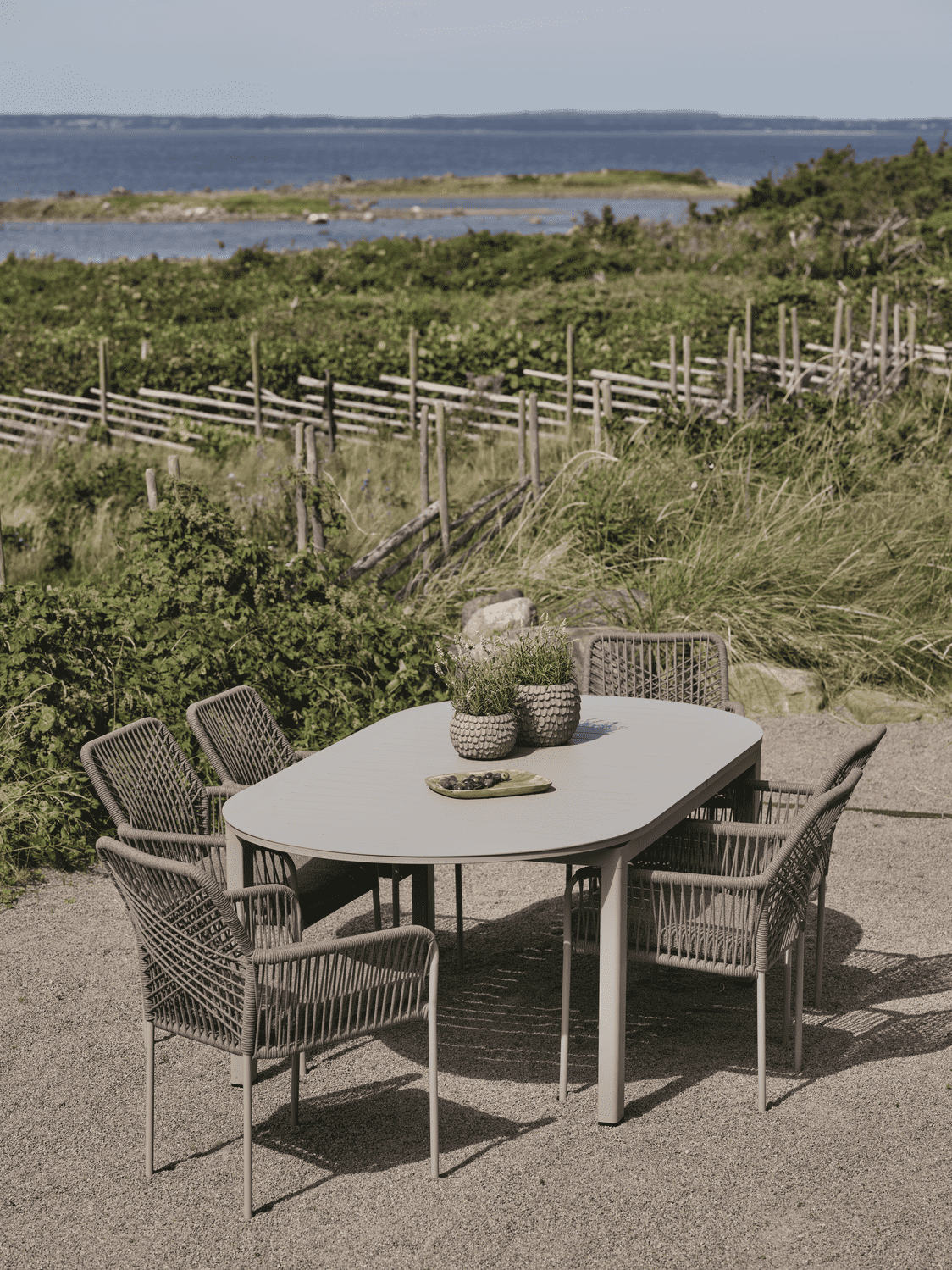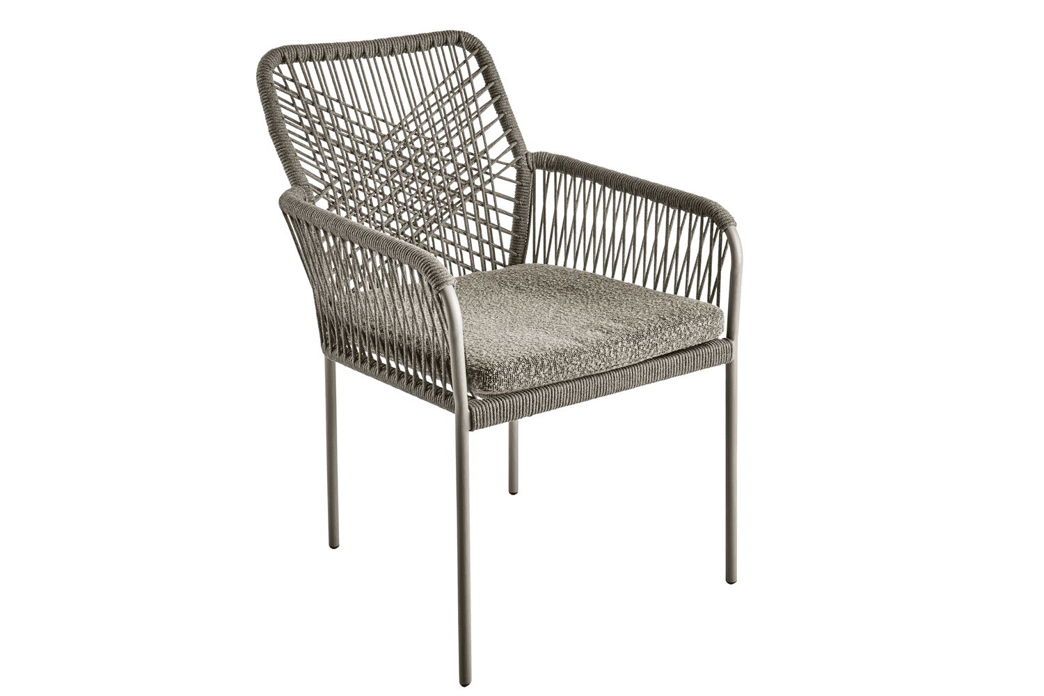 VIRA Stol – Khaki Denna bekväma matstol har en flätad repdesign som står emot väder och vind. Stålramen ger ett stabilt stöd samtidigt som den motstår rost och korrosion, vilket säkerställer långvarig användning i alla klimat. Det vackert flätade mönstret på sits och rygg ger en organisk känsla som förstärks av sina jordnära toner, och inbjuder dig att slappna av. Sittdyna ingår för extra komfort.