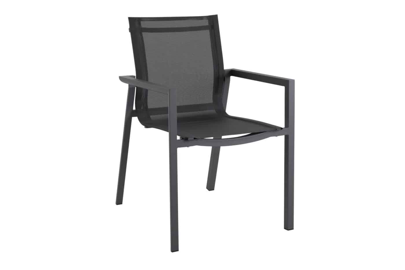 En stapelbar matstol i antracitgrå aluminium och grå textilene. Passar utmärkt ihop med Nimes matbord som finns i olika storlekar. Finns även passande sittdynor att köpa till för högre komfort.
