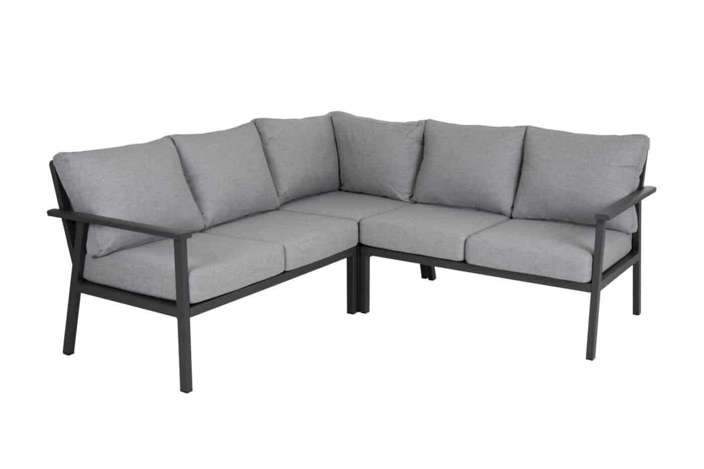 Loungesoffa i antracitgrå aluminium och pärlgrå dynor i olefin. Bord 90×90 cm ingår.