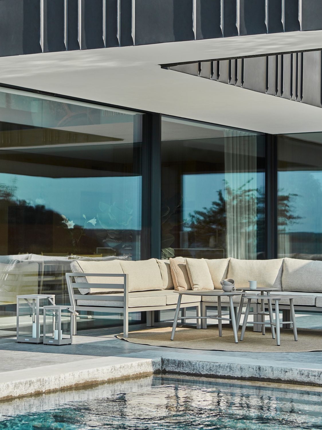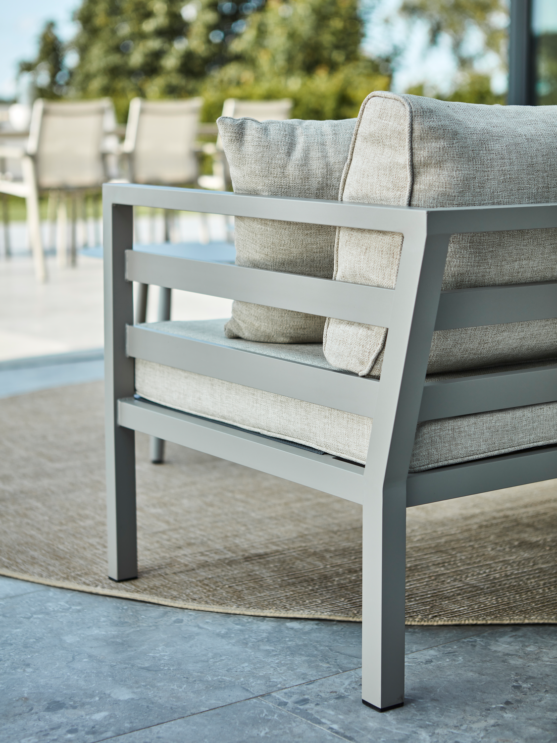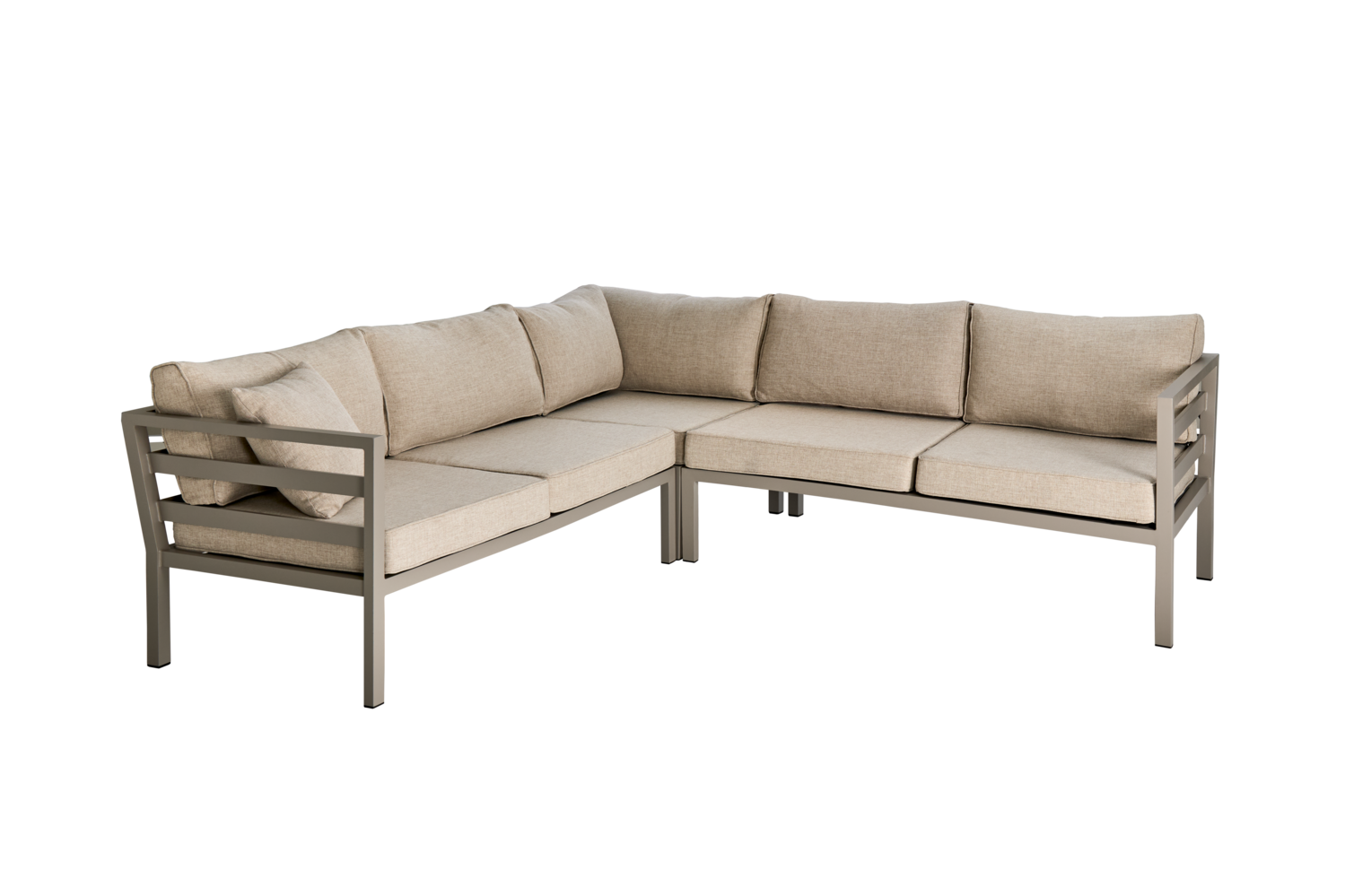 Weldon soffgrupp khaki m dyna är en snygg hörnsoffa med sandfärgade dynor i en kollektion möbler tillverkade av beige/khakifärgad aluminium med matt finish. Welldon kollektionen består av soffmoduler, fåtöljer, fotpallar och extra mittdelar som man kan köpa till och placera på valfri sida. Tillsammans skapar alltihop en stabil och elegant loungegrupp. Alla dynorna i serien har allvädersdynor med Quick-Dry foam i dynorna. Vilket innebär att dynorna inte suger åt sig vatten, utan istället rinner det igenom dynan och säkerställer därmed att den torkar upp snabbt. Man kan säga att dynorna är vattenbeständiga och soffan därmed vädertålig då det gäller exempelvis ett sommarregn på 15 minuter. Passar bra ihop med Vannes runda beige soffbord: Vannes. Andra exempel på soffbord är: Taverny eller Talance.